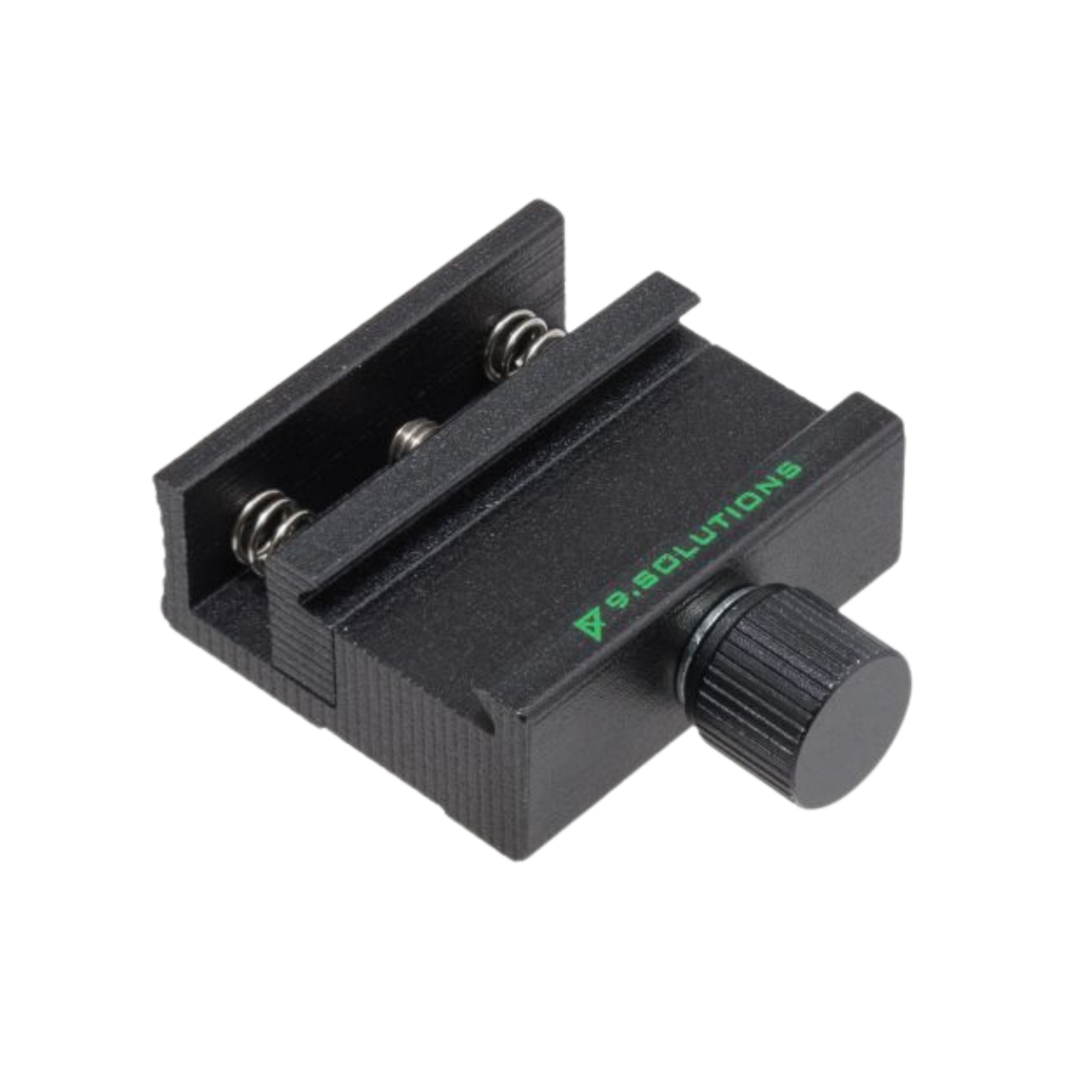 Due to its spring loaded clamping, this cold shoe clamp enables one to one-handedly mount shoe fitted equipment very easily. Its finger screw serves both as a push knob for opening the clamp and for tightening down the clamping securely.